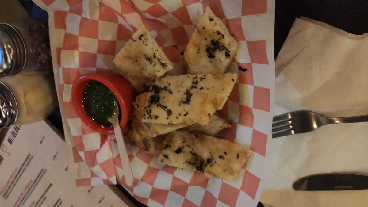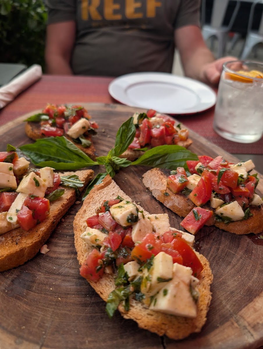 Food was great although I had to take off 1 star for the burnt toast on two of the five bruschetta. The topping was absolutely delicious fresh flavorful tomatoes and basil were on point. The pizza crust was perfect. Light airy and crispy. The sauce on the pizza was the perfect balance of sweet and savory. Toppings and cheese were also fab. The bugs were a bit distracting but you can't help that when eating outside.
